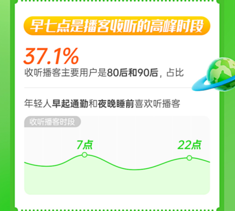 播客作为一种基于个人化表达,输出某一类价值观点的移动音频内容,正在成为“听书”热潮中刮起的一股新风。喜马拉雅数据显示,播客收听用户主要为80后、90后,占比37.1%。早七点被认为是播客收听的高峰时段,人们通过播客获取新闻热点、高价值话题讨论信息,让碎片时间变得更有价值。