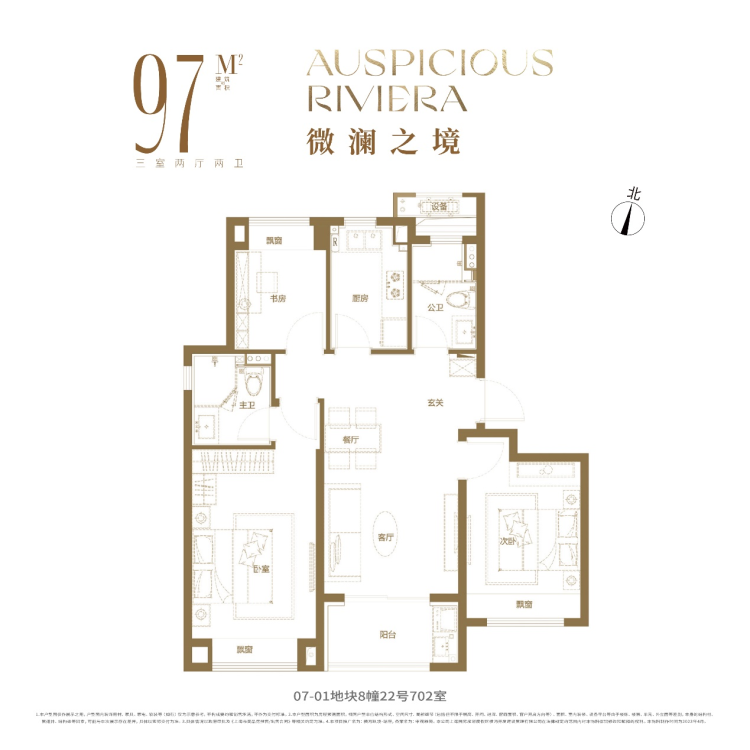而建筑面积约97㎡经典主力户型,做到3房2卫布局,格局是当下市场流行的户型,属于真正意义上的南北通透户型,三开间朝南、客厅大阳台、主卧套房等设计,堪称一步到位的爆款神户型。