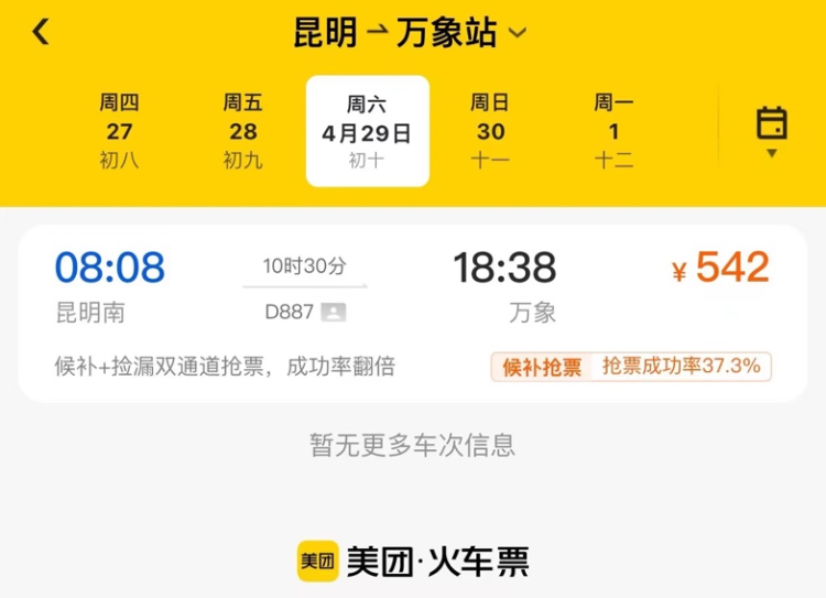 ▲ 4月29日的“昆明-万象”火车票已售罄