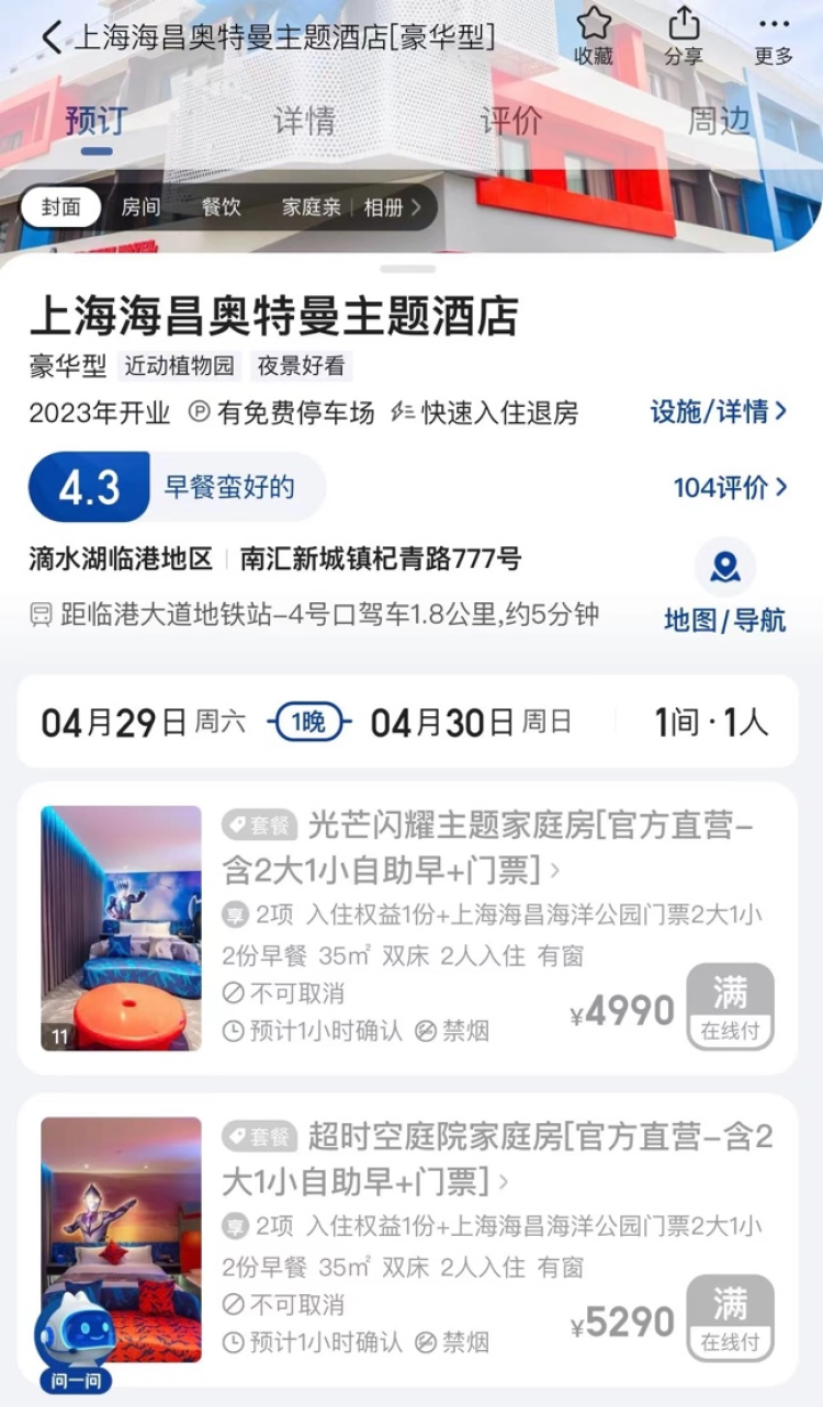 不少热门景区的门票预订量增幅显著。上海海昌海洋公园五一假期前一周门票预订量是2019年同期6倍,五一假期期间门票预订量超2019年预订量约13倍,外地客源占比从五成提升至七成。截至发稿时,奥特曼主题酒店已几近满房。