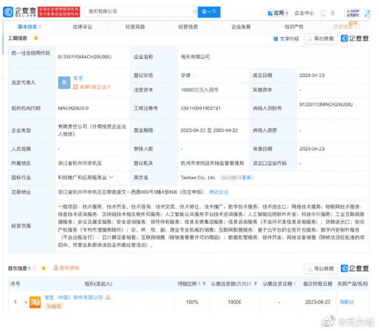 4 月 24 日,据元力社报道,天眼查显示,淘天有限公司于 4 月 23 日成立,法定代表人为朱坚,注册资本为 1 亿人民币,经营范围含技术服务、数字技术服务、区块链技术相关软件和服务、人工智能公共服务平台技术咨询服务、科技中介服务、工业互联网数据服务、基于云平台的业务外包服务、数据处理服务等。