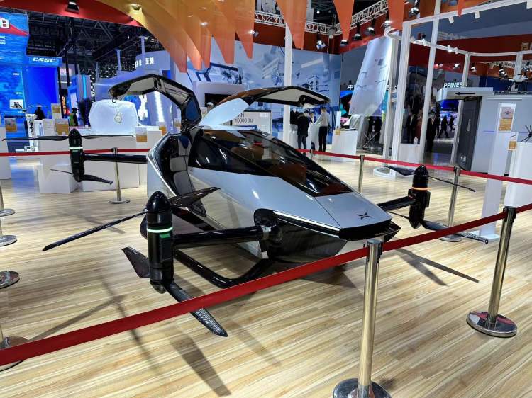 由小鹏汇天自主研发制造的第五代产品旅航者X2出现在2023中国品牌日现场。黑灰的机身造型犹如一颗水滴,开启的机门犹如一对展向天空的翅膀。