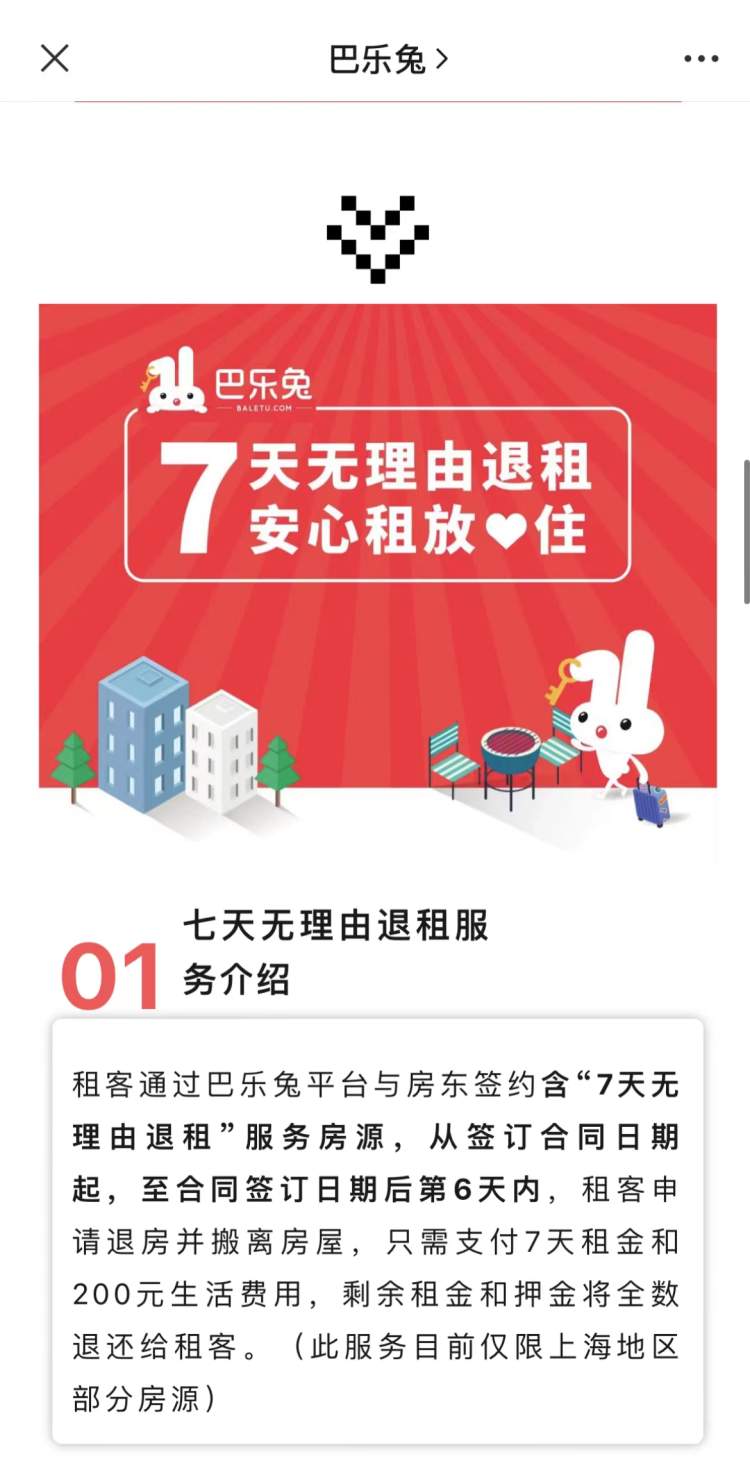 帮办记者调查发现,巴乐兔平台曾经推出过“七天无理由退租”服务,该服务介绍称,从签订合同日期起,至签订合同日期后第6天内,租客申请退房并搬离房屋,只需支付7天租金和200元生活费用,剩余租金和押金将全数退还给租客。