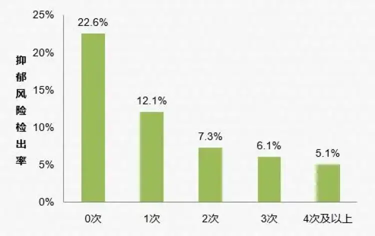 报告发布的一组研究数据表明,每周运动次数为0次的调查对象中,抑郁风险检出率高达22.6%,比每周运动1次的人群高10.5个百分点,比每周运动3次的人群高16.5个百分点。