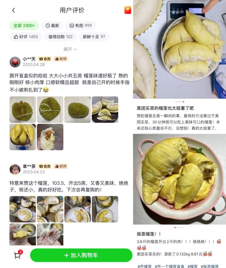 美团买菜水果采购相关负责人介绍,“很多用户收到榴莲后,也第一时间晒单,在产品评论区分享开‘盲盒’的乐趣,比如开到5房、6房的用户就会觉得自己很幸运,隔着屏幕我们也能感受到用户是真的很开心。”