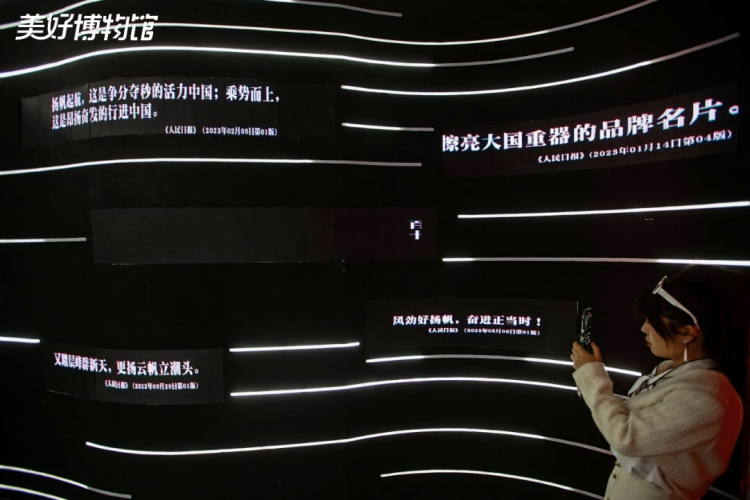 时光长河,见证美好。在这条创意通道中,通过全息投影技术,一起回顾改革开放以来中国在各领域取得的巨大成就,“风劲好扬帆,奋进正当时!”参观者在光影的流线设计中感受时代风华。