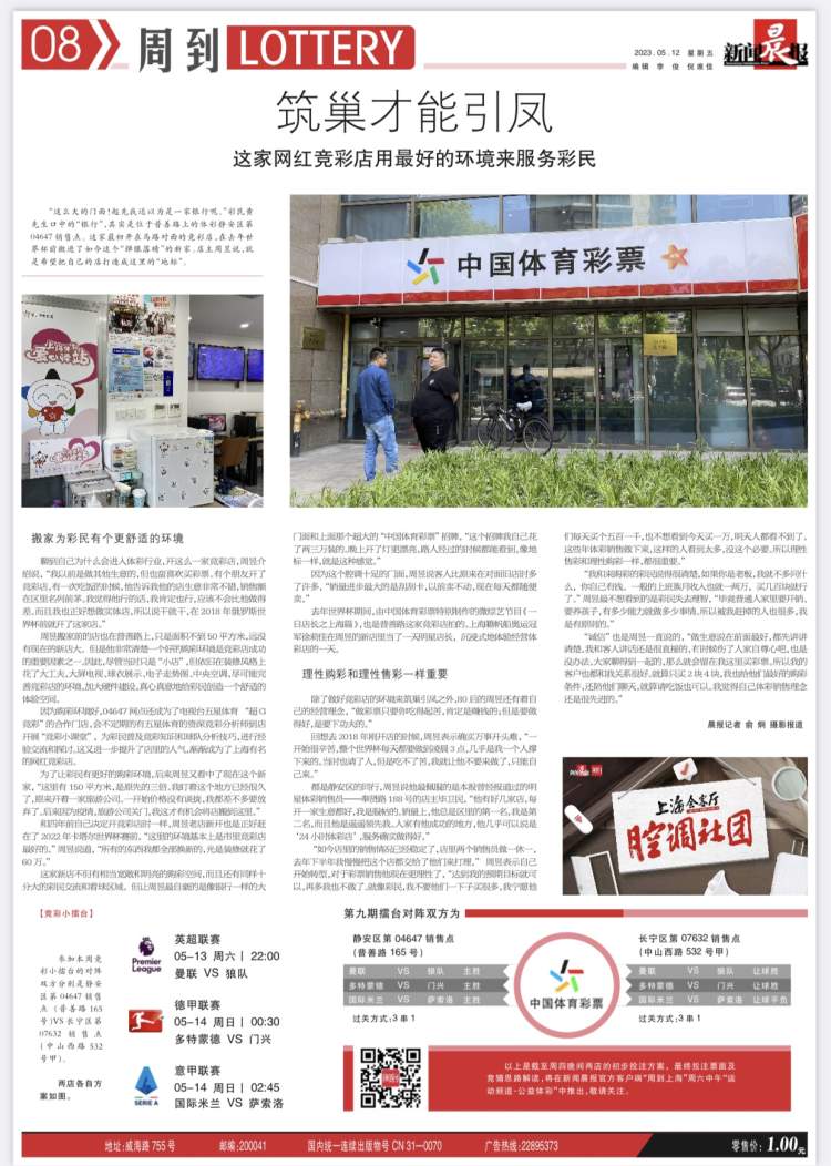 因为购彩环境好,04647网点还成为了电视台五星体育“超G竞彩”的合作门店,会不定期的有五星体育的资深竞彩分析师到店开展“竞彩小课堂”,为彩民普及竞彩知识和球队分析技巧,进行经验交流和探讨。这又进一步提升了店里的人气,渐渐成为了上海有名的网红竞彩店。