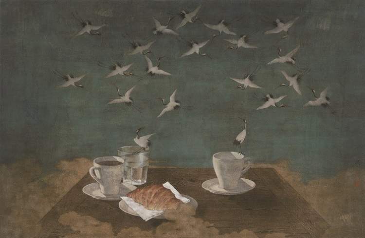 而洪健的《瑞鹤图》画面十分有趣,上面三分之二是向宋徽宗致敬的瑞鹤与祥云,而宋徽宗原作中,下方的宫廷屋顶,被洪健置换成了可颂面包和咖啡,变成了今天人生活休闲的场景,等于是将超现实主义加上了解构主义,梦幻中增添了幽默。洪健能跟宋徽宗跨越千年进行对话,这不是一般的能量。