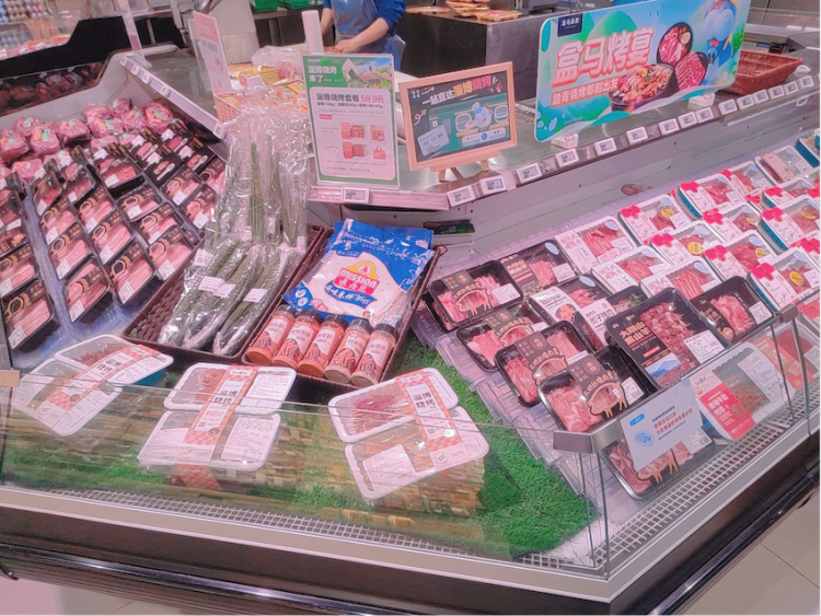 近日,盒马上线了上百款烧烤商品,大别山黑山羊羊肉串、澳洲进口的M级和牛,以及配齐小葱、小饼的淄博烧烤套餐等商品,颇受欢迎,成为爆款。