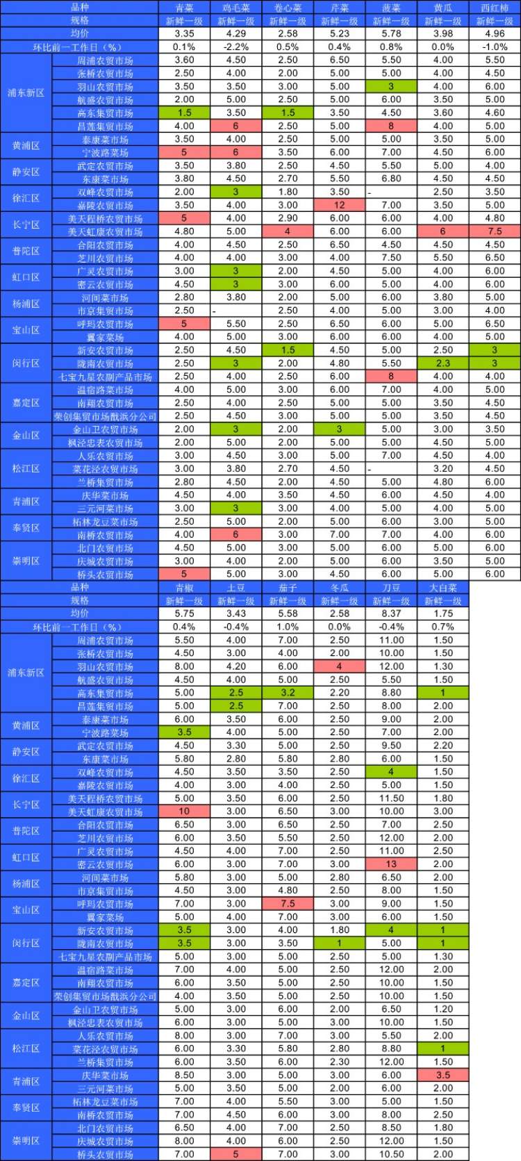 ■粉底标注代表该蔬菜品种在上述农贸市场或超市的最高价;绿底标注代表该蔬菜品种在上述农贸市场或超市的最低价