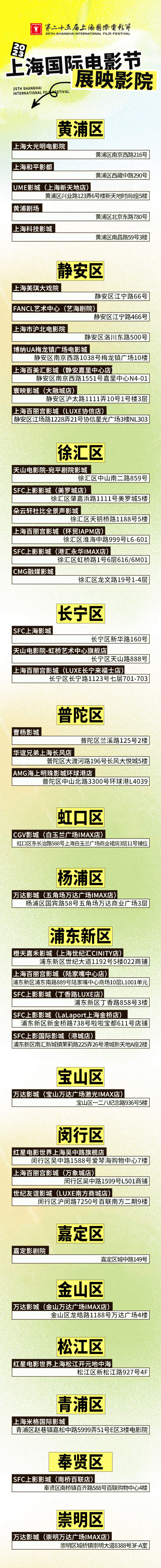 在经过设备稳定性、放映质量、服务质量、交通环境等多维度遴选后,上海共41家影院成为今年上海国际电影节指定展映影院,覆盖上海16个区。