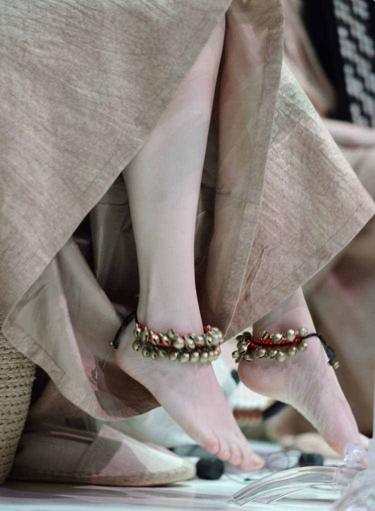 服装造型上,《云之上》汲取东方美学灵感,结合当代艺术审美,历经13次修改,6次试穿调整。服装设计黄婉冰和造型设计李琳洁为每位演员量身定制专属服装、发型与妆面:“艺术家们的演奏动作和与器乐间的共鸣,让我们想到以‘旋律起伏’作为系列设计的主要元素,通过浪漫飘逸、灵动优雅的层叠组合呼应音乐的多样性和动态性。为了保持服装与不同民族乐器视觉上的和谐,并在舞台场景中呈现时尚质感,特别选择了天然系面料和大地色系的有机色彩,与演出现场的灯光设计之美相互映衬。”