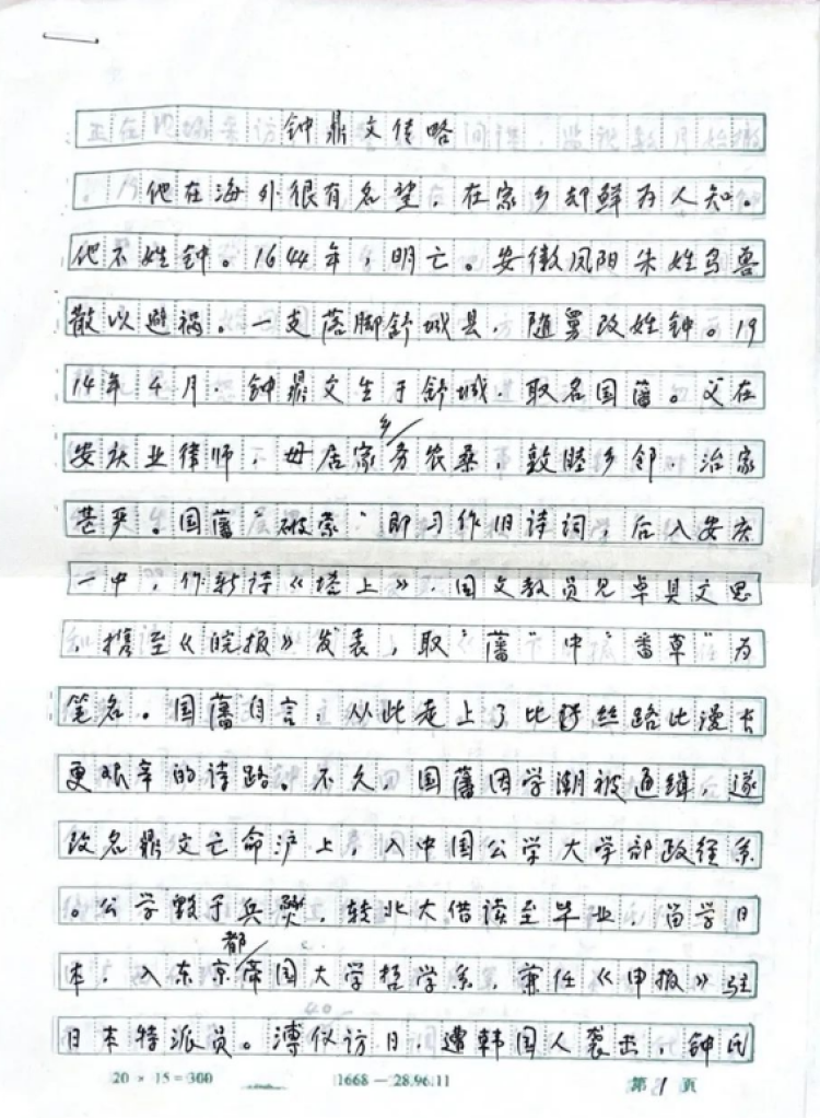 李景涵在来信《钟鼎文传略》(第1页)
