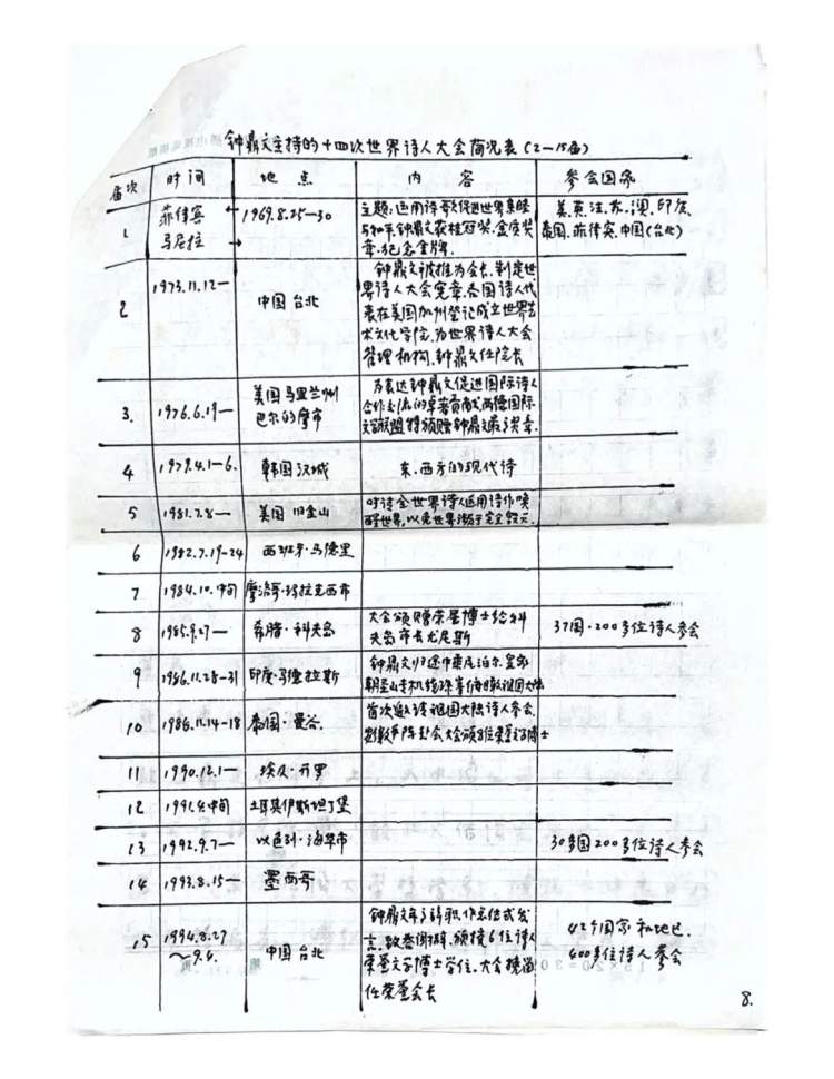 钟鼎文主持的14次世界诗人大会简况表(第8页)