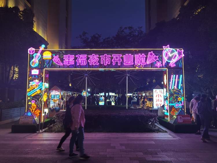 横亘在两栋楼宇间有个入口门栏,镶满了五颜六色的氛围彩灯,最上方紫色的“幸福夜市开业啦”七个大字在夜幕中格外醒目。