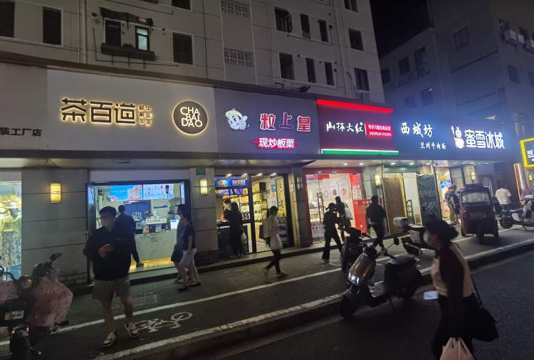 如今的闻喜路,仍保留了一些“美食基因”:旺美餐厅、沪大成麻辣小龙虾、8号饭堂……但与昔日彭浦夜市名声在外相比,现在却和沿街餐饮较多的寻常街道差别不大。短短二三十米的距离,马路两边的连锁茶饮店就包括了1点点、7分甜、蜜雪冰城、茶百道、桂桂茶、COCO六家。而在一小区之隔的临汾路,道路两侧灯光幽暗,连店铺都少见了。