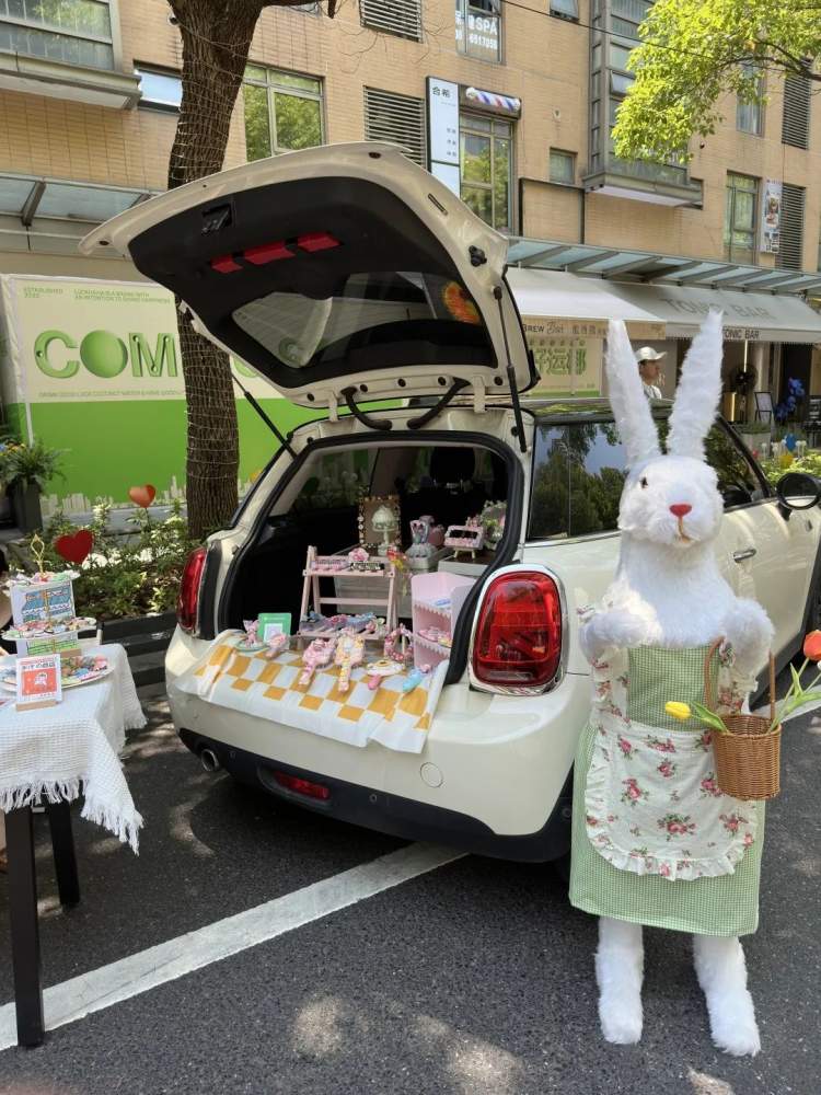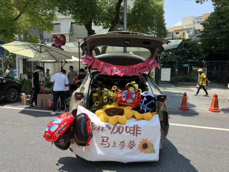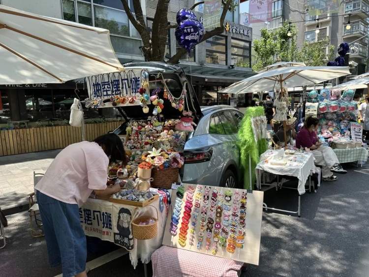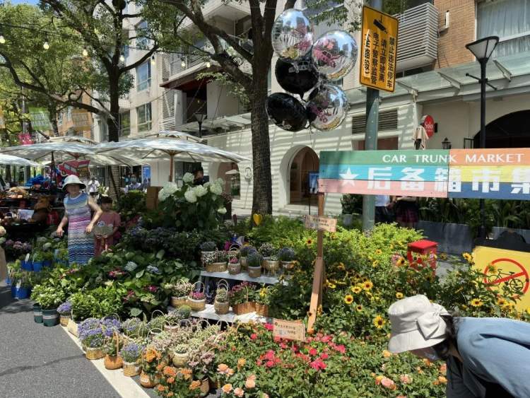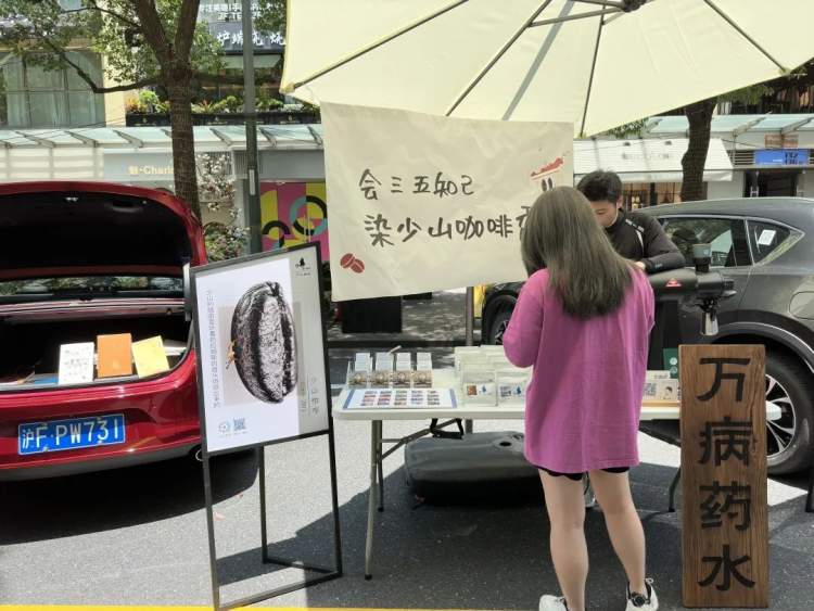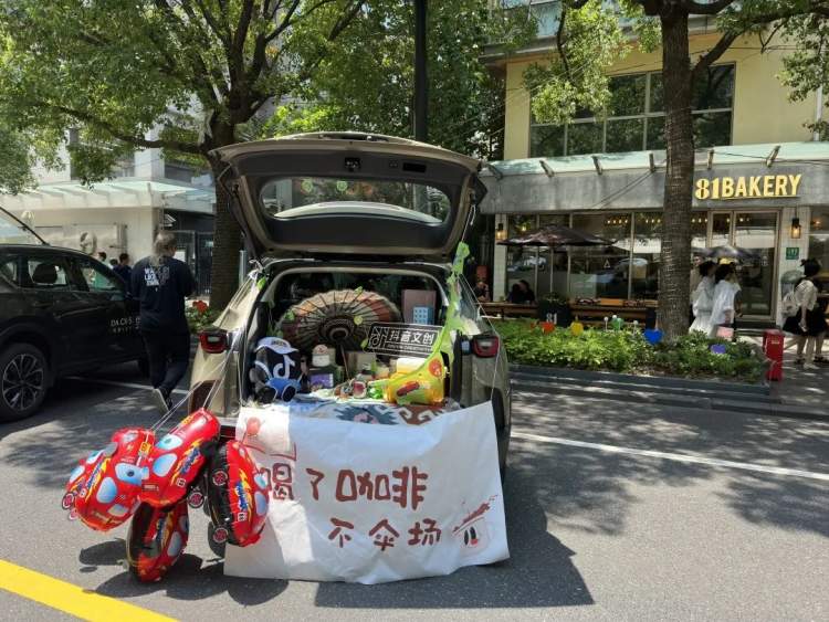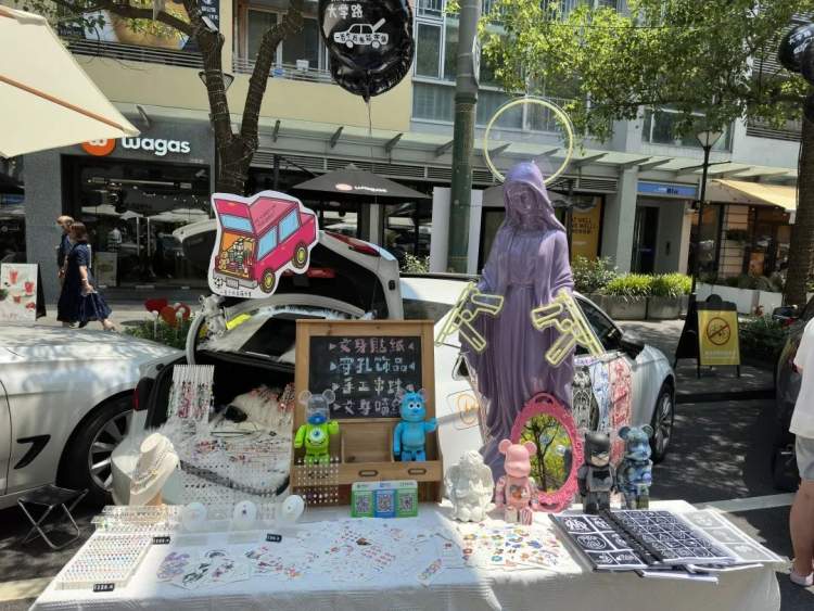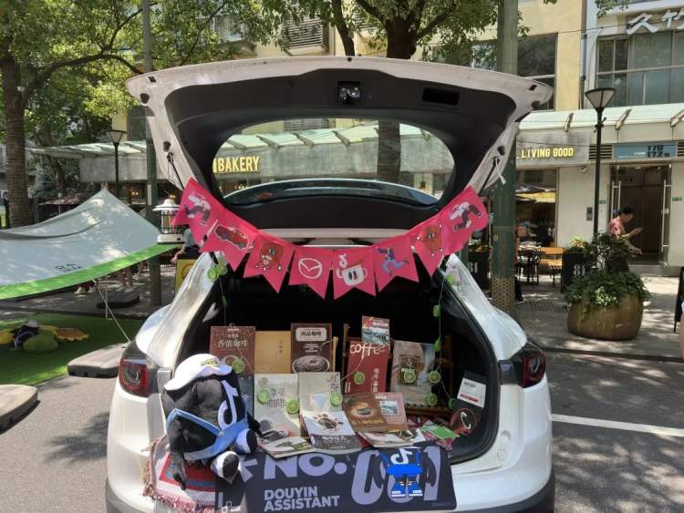 本次后备箱集市除了咖啡外,还有其他四块区域,分别为鲜花、抖音文创、书和互动区。鲜花、玩偶、绘画……各类可爱的、好玩的、有意思的小物件令人目不暇接。