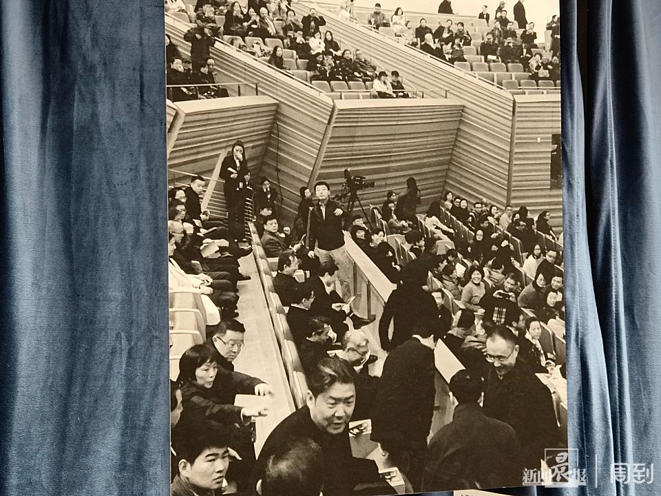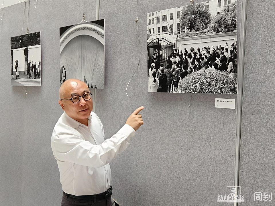 张力奋在“上海手记”摄影展自己的作品前,图右是他拍摄的蒋昌建教授