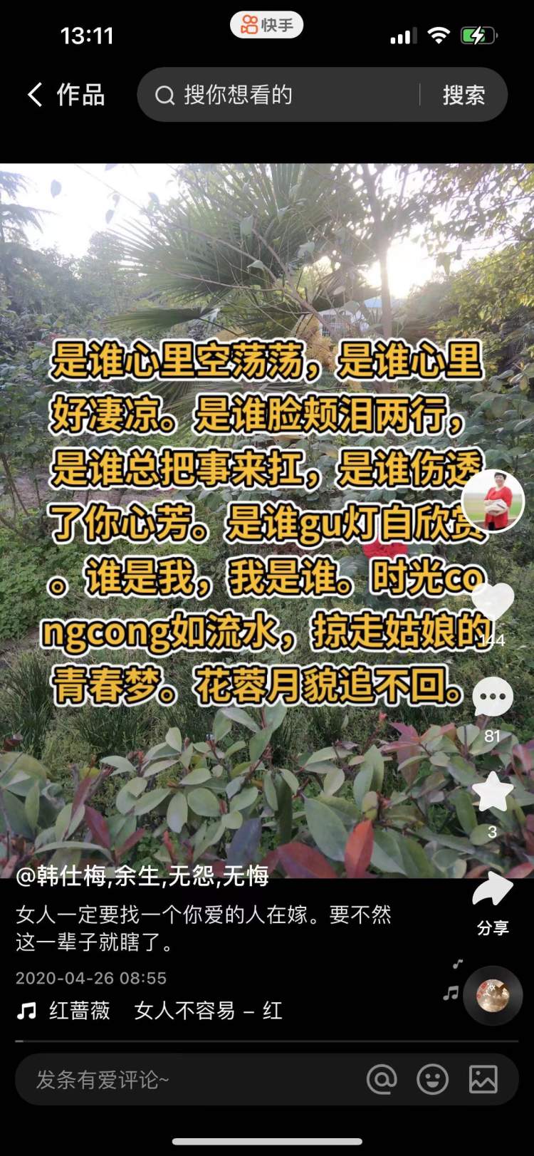 她在快手上发表的第一首作品现在还能看到,那是2020年4月的时候,里面有几个错别字,有些字索性用了拼音。韩仕梅不怕丢脸,她说这就是自己最真实的写照:一个初中都没念完的普通农妇。