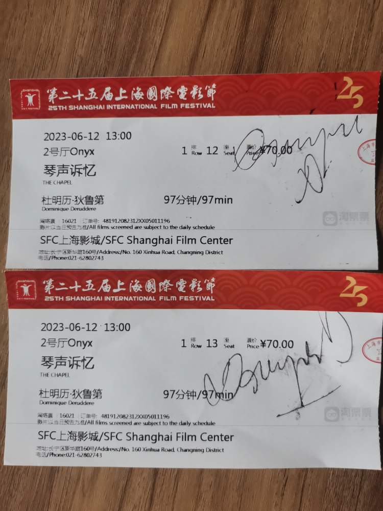 陆女士还向晨报记者展示了她多年来购买的电影票,一家人几乎是一年不落地参与上海国际电影节。这回观看《琴声诉忆》,陆女士不仅是冲着其入围金爵奖主竞赛单元的品质,也想带母亲来看看焕新后的上海影城,“我想入围金爵奖主竞赛单元的电影一定是好片子,比利时的电影平时也很难看到,专门来看一下”。