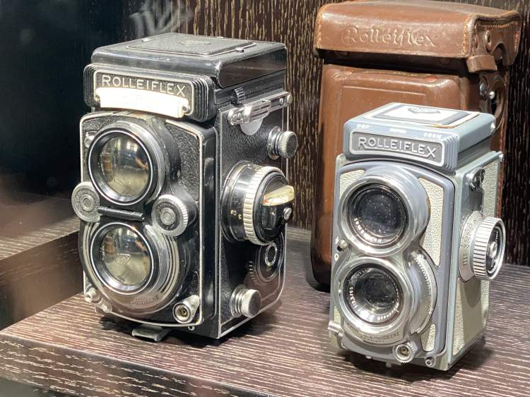 双反古董相机,也是这里重要的藏品。像康特弗莱克斯双镜头反光相机,有一个霸气的中文名字、被上海人称作“万吨水压机”。