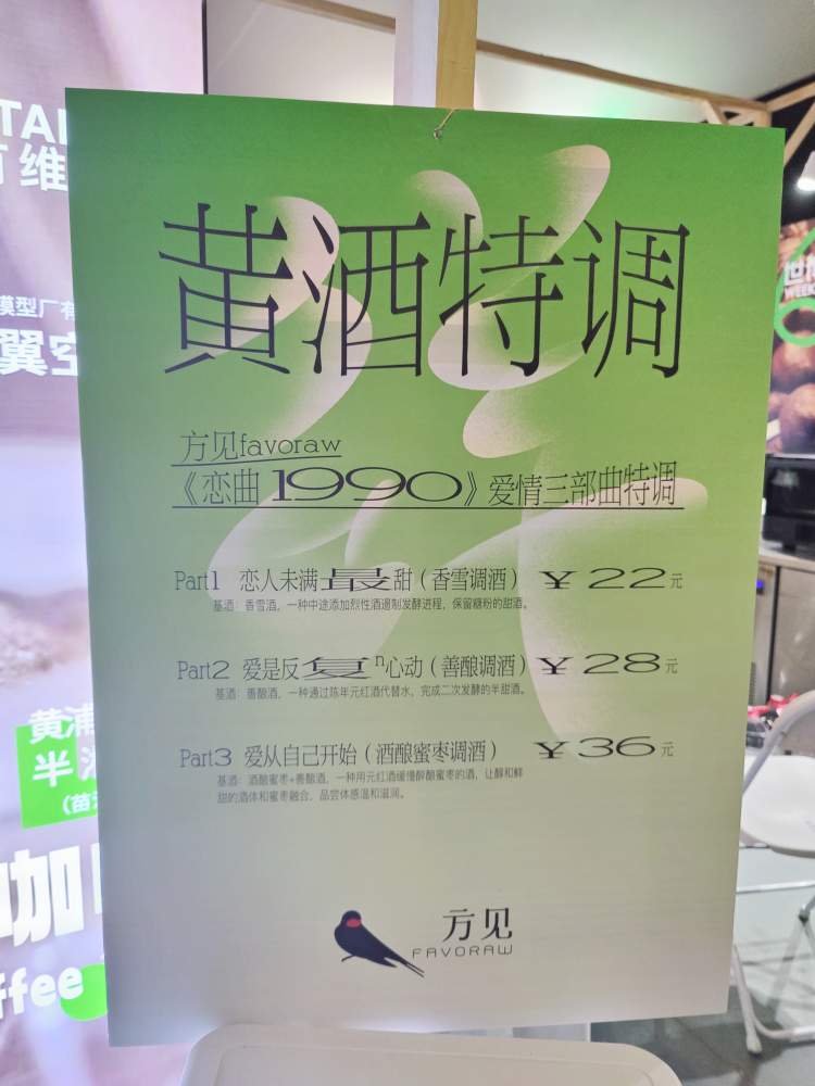 如果说咖啡让人保持清醒,那么微醺则是对生活的另一种慰藉。对于70后的张先生来说,在市集上最让他感到惊喜的,便是找到了青春回忆。一首《恋曲1990》,一杯由歌曲延伸出的黄酒特调,一切都恰当好处。此次市集上,“方见favoraw”带来了《恋曲1990》爱情三部曲特调:恋人未满最甜(香雪调酒)、爱是反复心动(善酿调酒)、爱从自己开始(酒酿蜜枣调酒)。“不同的人听歌有不同的感受,饮酒也是如此。”三两好友,小酌一杯,开启美好夏日夜晚的序幕,共同创造美好时光的回忆。