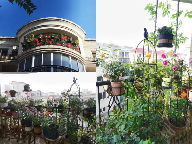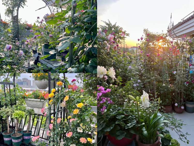 肖女士的露台上,月季、铁线莲等各种花卉,一年四季花开不断。