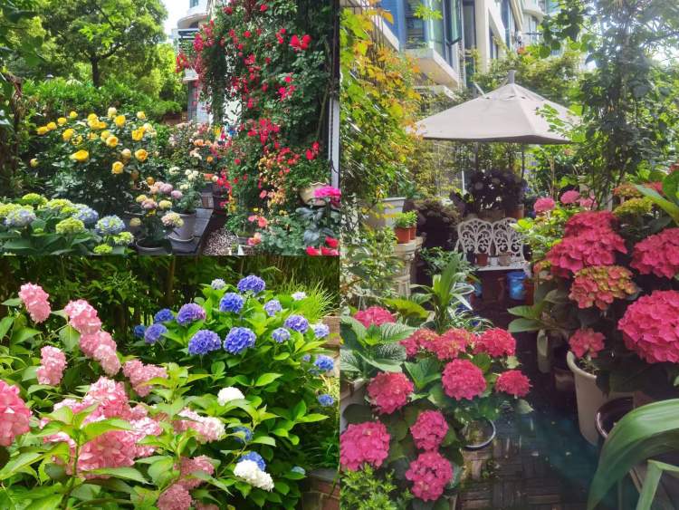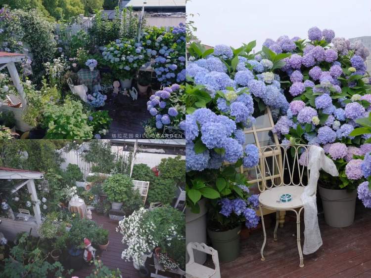 瑞拉的露台花园在3楼屋顶上,露天面积25平方米,阳光房8平方米。每年5-6月绣球盛开季节,蓝色花海吸引了很多邻居和花友们前来,是小区里的网红花园。