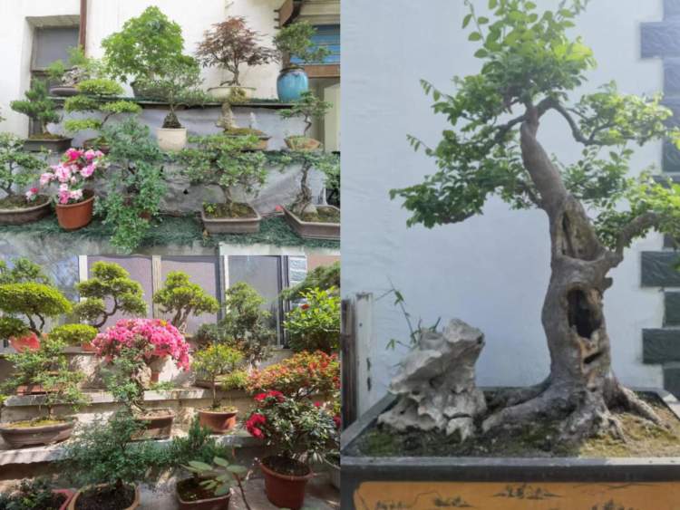 这是一个盆景特色的庭院,有榆树、雀梅、黄杨、胡秃子等杂木盆栽60余盆,大部分都是俞先生自己挖掘、培育、修剪、攀扎而成,是他近20年的心血。其中最具特色的是一棵枯木榆树,2018年一次外出钓鱼时发现,当时树木已枯,拿回家后养桩3年,上盆2年,目前老枯树已换发新活力。