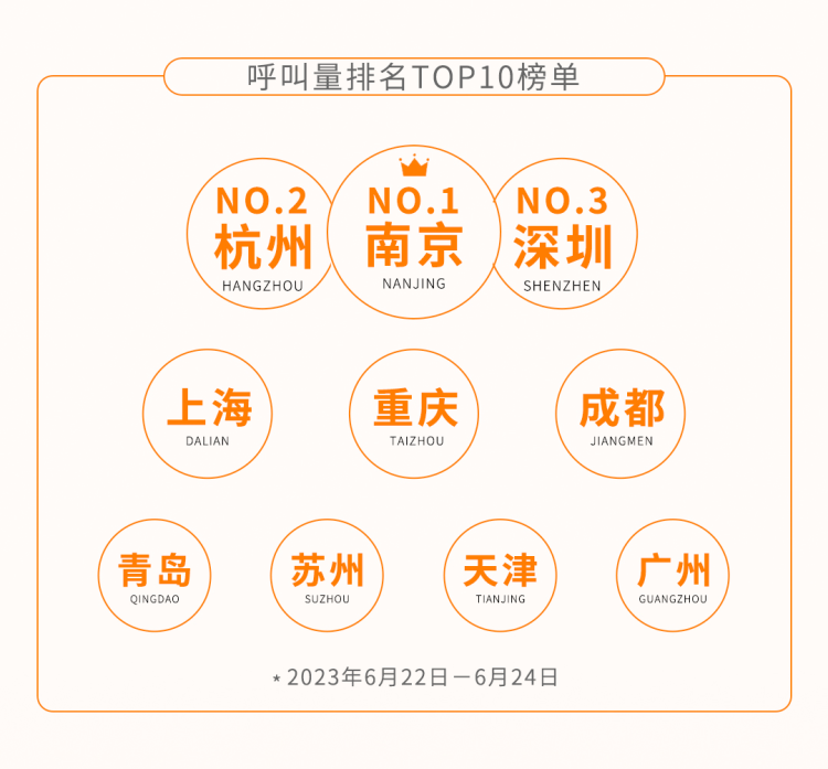 从T3出行用户出行订单分布数据来看,出行订单量Top10城市分别为南京、杭州、深圳、上海、重庆、成都、青岛、苏州、天津、广州,诸多核心一二线城市持续霸榜五一、端午最火爆城市名单。T3出行相关负责人表示:“为躲避持续的高温,诸多用户爱前往青岛等凉爽的海岛城市度假;恰逢暑期临近,不少家庭也选择南京、上海、杭州、重庆等历史文化丰富、游乐设施多元的一二线城市亲子游。”