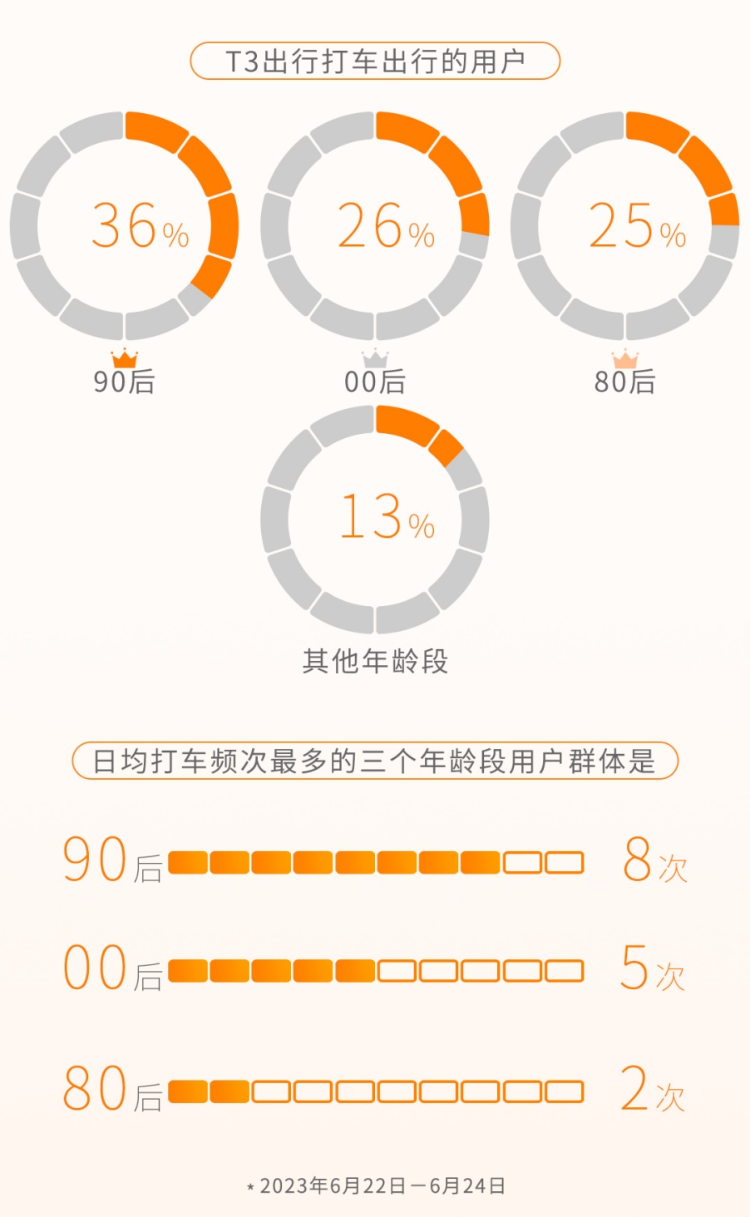 不少年轻人打车出行频次也显著增加。T3出行大数据显示,端午期间,日均打车频次最多的三个年龄段用户群体是90后、00后、80后,分别为8次、5次、2次;其中,90后年轻人群体是名副其实的打车出游主力。