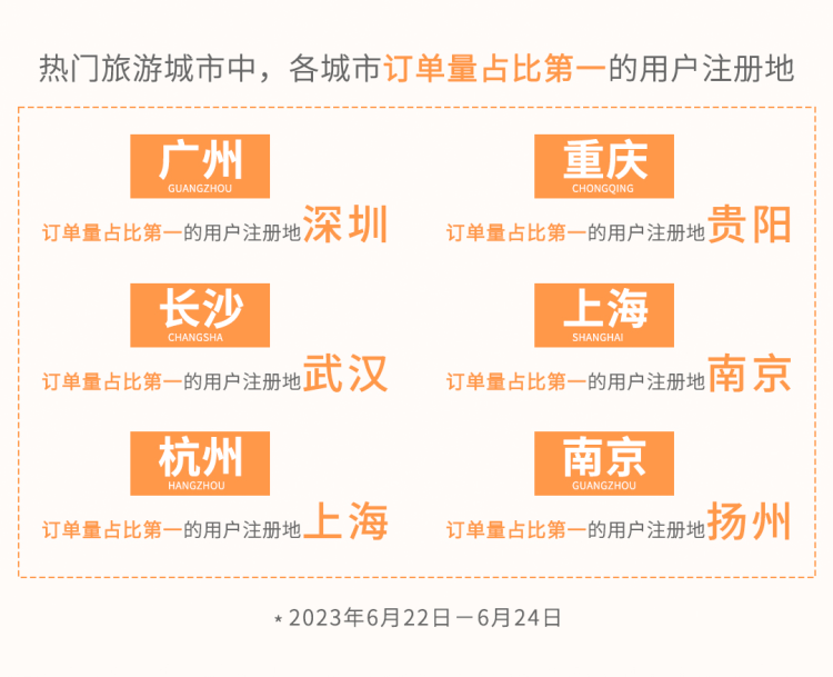 值得一提的是,继五一交换出行后,端午跨城出行还出现了一种新型的出行方式——两小时旅游圈出游。T3出行数据印证,端午期间,在广州、重庆、长沙、上海、杭州、南京等热门旅游城市中,各城市订单量占比第一的用户注册地显示为深圳、贵阳、武汉、南京、上海、扬州。“这些城市之间都是高铁出发两小时以内到达的城市,可见,今年端午越来越多用户开始选择了跨城近距离出游。”上述负责人说道。