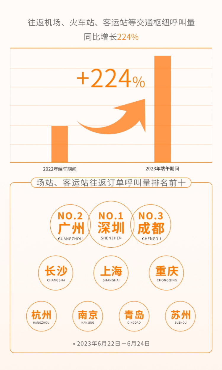 今年端午小长假,跨城出行依旧火爆,这在T3出行数据中得到了印证。据悉,6月22日至6月24日期间,往返机场、火车站、客运站等交通枢纽呼叫量同比增长224%,深圳、广州、成都、长沙、上海、重庆、杭州、南京、青岛、苏州是场站、客运站往返订单呼叫量排名前十的城市。