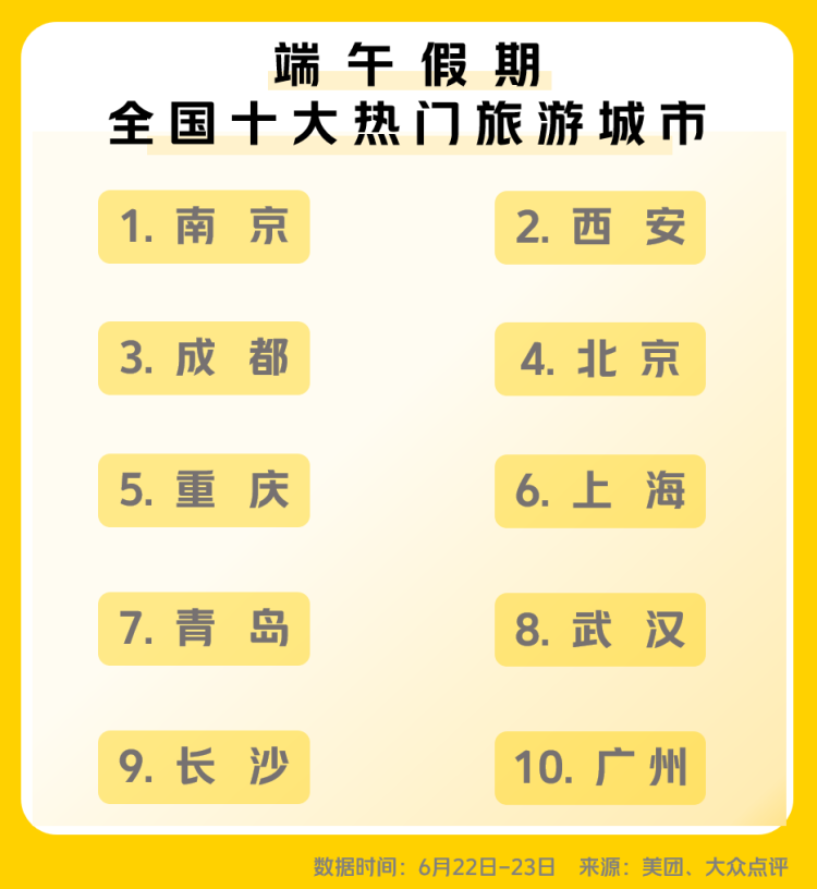 ▲图为综合美团、大众点评文旅数据测算的端午假期“全国十大热门旅游城市”。(制图:夏宁)