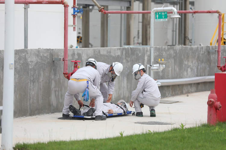 ▲演练假设物料管线泄漏致一名工作人员中毒晕倒