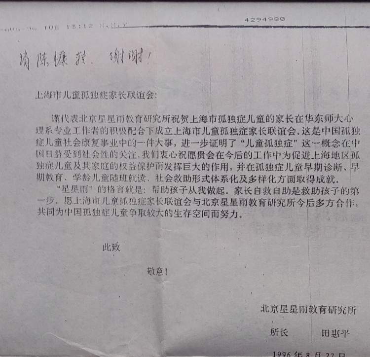 ▲上海成立儿童孤独症家长联谊会后收到田惠平老师旳贺信