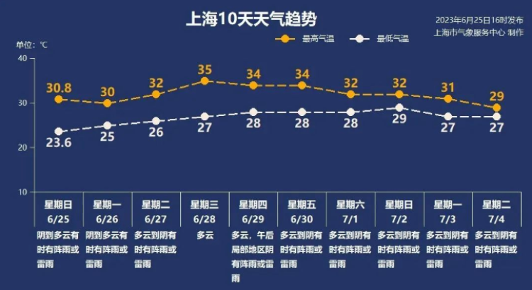 26日阴到多云有时有阵雨或雷雨,局部地区可达大雨。气温最低25℃,最高30℃,相对湿度95%-70%,西南风3-4级。本周中期,副热带高压重整旗鼓,西伸北抬,阳光插空回归,气温再上一台阶,最高气温回升至34~35℃左右,大气中不稳定能量积聚,易引发局部阵雨或雷雨。