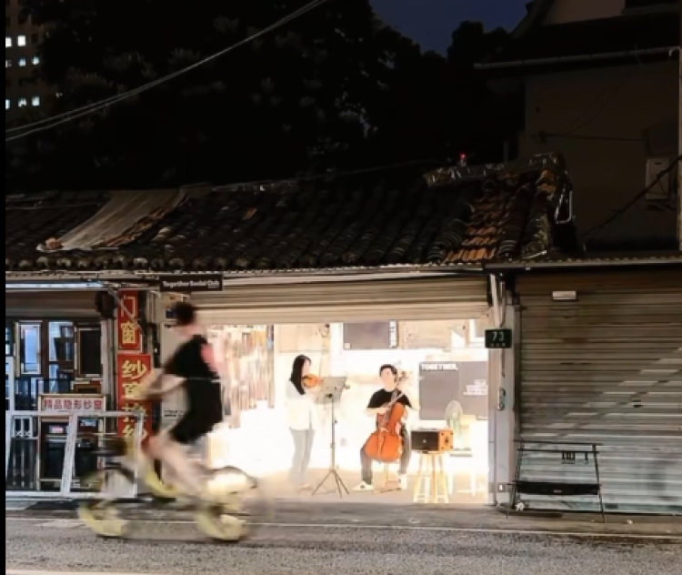 据悉,两位演奏者均为提琴手,女生兔兔是小提琴手,毕业于上海音乐学院小提琴与音乐剧双专业,曾在国际比赛中获奖,常年活跃在各地音乐会舞台,而临时加入的男生嘉衍是大提琴手。兔兔告诉记者,她是由“Together Social Club”邀请来安化路73号进行表演,并不是商业演出,也没有费用。