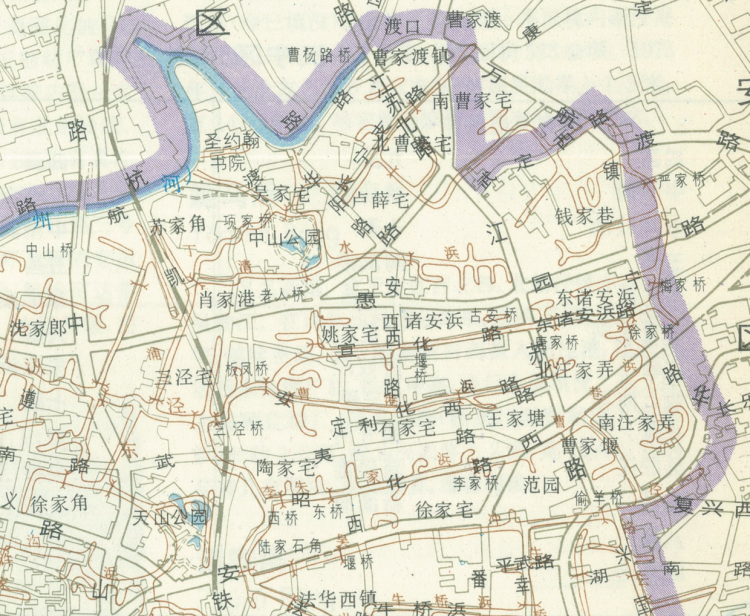 至于安化路的由来,上海测绘院张渊源告诉记者,安化路其实与河有关,并提供了1986年上海的历史河道地图(见下图),其中,棕色线条是历史上的河道。相关资料显示,1950年代,安化路由曹洪浜、诸安浜和周家浜填平筑路而成,所以老上海认为安化路是“躺在三条河上的马路”。