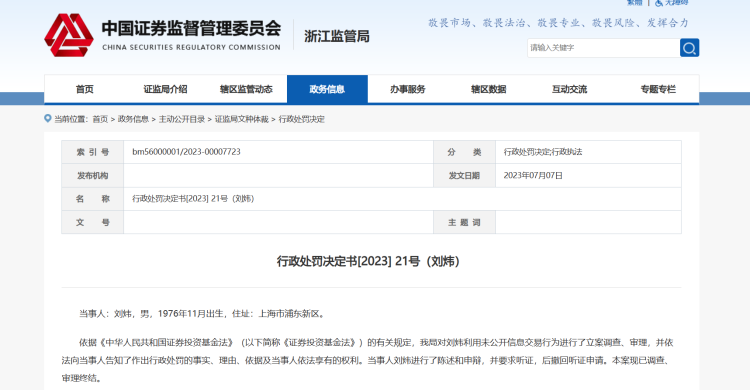 7月7日,证监会浙江监管局公布了一则处罚公告,显示浙商基金前基金经理“老鼠仓”行为被处罚。处罚决定书显示,浙商基金前基金经理刘某控制他人证券账户,趋同交易合计成交金额1760.24万元,趋同交易合计亏损36.51万元,最终被罚款30万元。