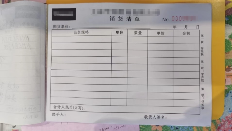 记者看到,在微信上下单时,销售人员会提供带有品名、价格等信息的销货清单,“我们会把单子开好后拍照给你看,确认好以后再转账,送货信息直接发在微信上,如果不方便到店取发票,可以把发票以及手工单的黄页一起寄给你。”