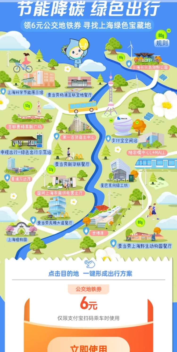 此外,7月10日至7月31日,市民打开支付宝APP搜索“节能宣传周”,即可免费领取6元公交地铁出行礼包。同时,在活动页点击地图中任一绿色宝藏地图标,可一键生成行程路线规划。