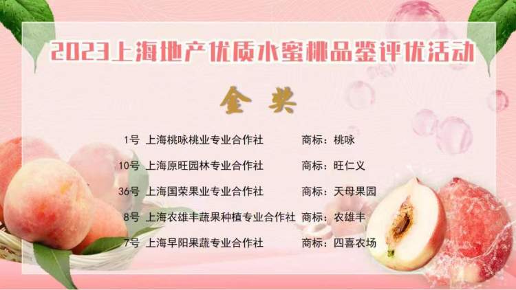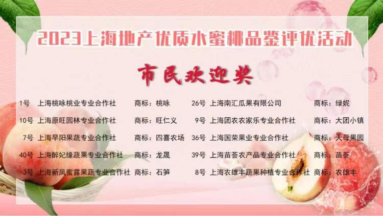 最终,综合专家和市民评委的分值,评选出2023上海地产优质水蜜桃金奖5个,市民欢迎奖10个。