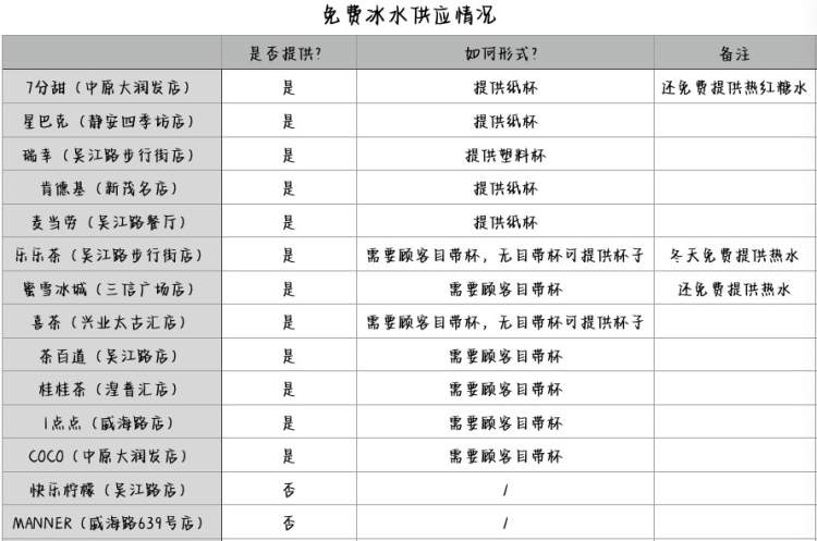 在随机选择的14家连锁饮品门店中,除快乐柠檬(吴江路店)和MANNER(威海路639号店)以外,其余12家均可提供免费冰水。
