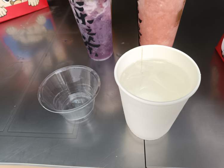 7分甜(中原大润发店)更为特别,店员表示不仅提供冰水,还能提供热红糖水。当顾客想要一杯热红糖水时,店员会取出一块透明小袋独立包装的红糖块,当场将其冲入热水中化开,到手杯身滚烫,非常适合在暴雨降温天暖胃暖心。