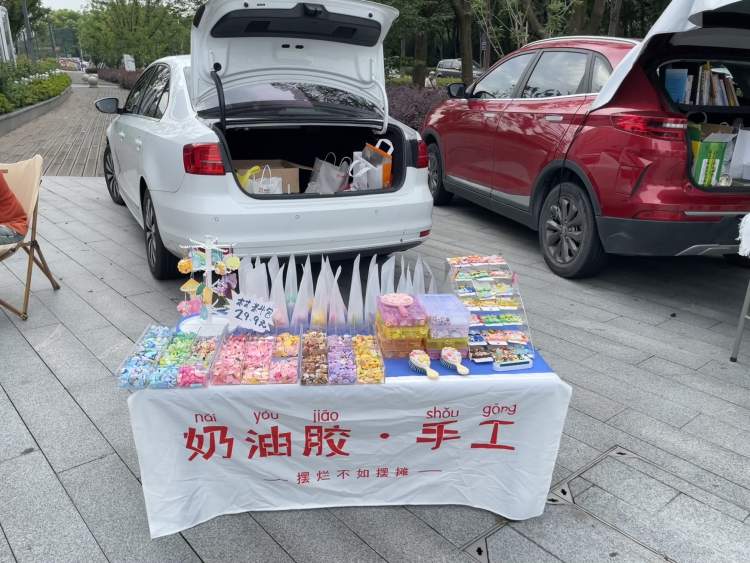 “不知道是因为换了地方,还是改变了策略,”在后备箱集市摆摊的2天,汪玲也一改之前卖奶油胶手工成品的策略,改为直接卖材料,告诉前来的顾客手工制作的步骤,然后让他们买了材料自己回去做,这一做法反而受到不少家长的欢迎——不少家长买原材料回去,陪着孩子一起做手工,享受亲子时间。