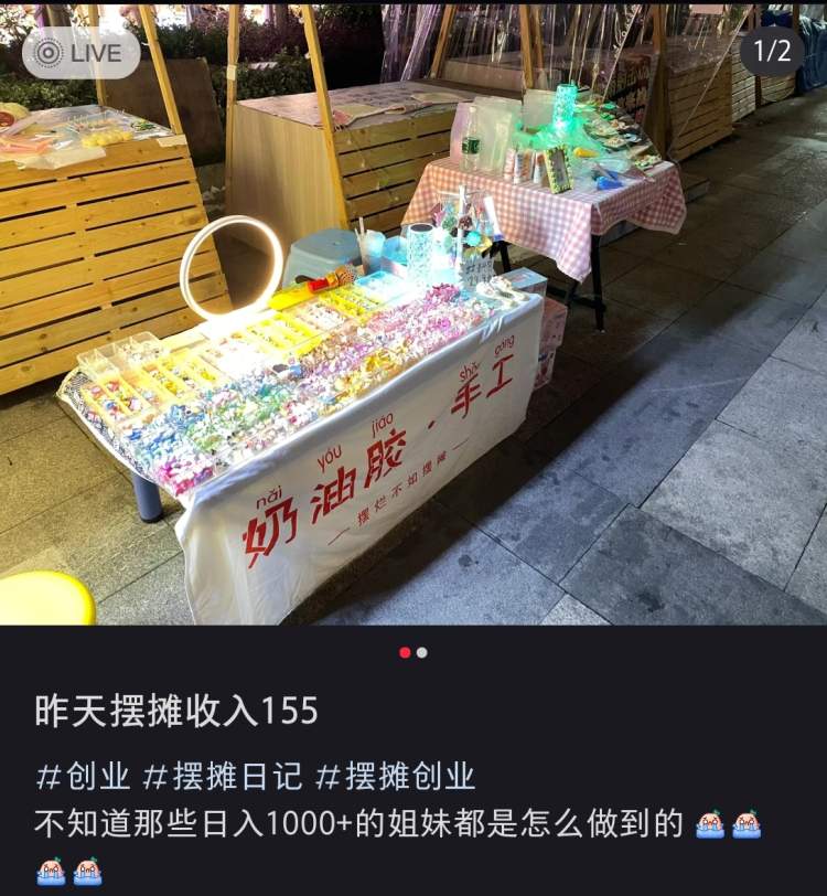 在社交平台,“裸辞去摆摊,收入¥1000+/天”的经验分享也成为新晋热门话题,吸引了不少人加入摆摊的行列,汪玲也是其中之一。在免费摊位摆摊3周后,她火了,因为“一顿操作猛如虎一天收入25”“免费摊位这么多 竟然只有我一人”等的经验分享,让人们看到了摆摊生活的另一面。