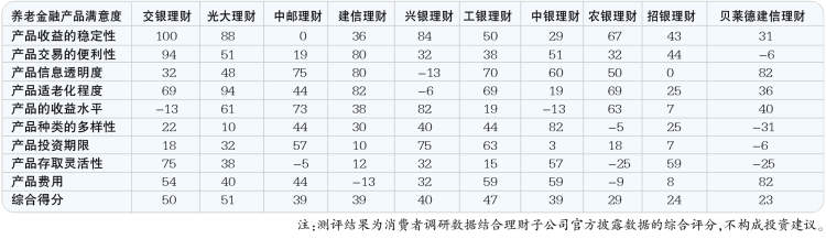 根据官方披露的数据来看,参评的10家银行理财子公司发行的养老理财产品在收益稳定性、交易便利性和适老化程度几个方面都具有较高的分数,风险等级普遍较低,适合老年消费者购买。而对于产品的信息透明度、收益水平、存取灵活性、投资期限、产品种类、产品费用这几个方面,不同的银行理财子公司展现了不同的侧重和优势,需要消费者根据自己的需求进一步选择。