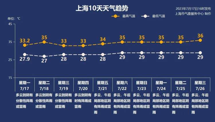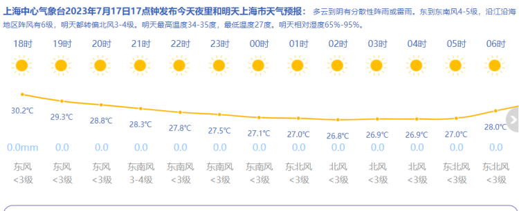 明天上海多云到阴为主,仍有分散性阵雨或雷雨,最低气温27℃,最高34℃~35℃,相对湿度下95%~65%,偏北风3~4级,体感比今天热一些。