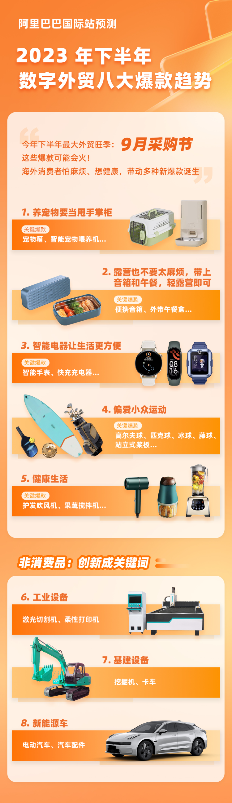 与此同时,在2023数字外贸半年报中,阿里国际站还预测了下半年最大外贸旺季9月采购节的8大爆款,除了新能源、电动汽车等“新三样”外,还有柔性定制打印机、激光切割机、挖掘机等具有更高科技含量的机械设备正在或即将进入高增长周期。